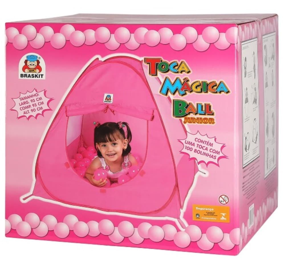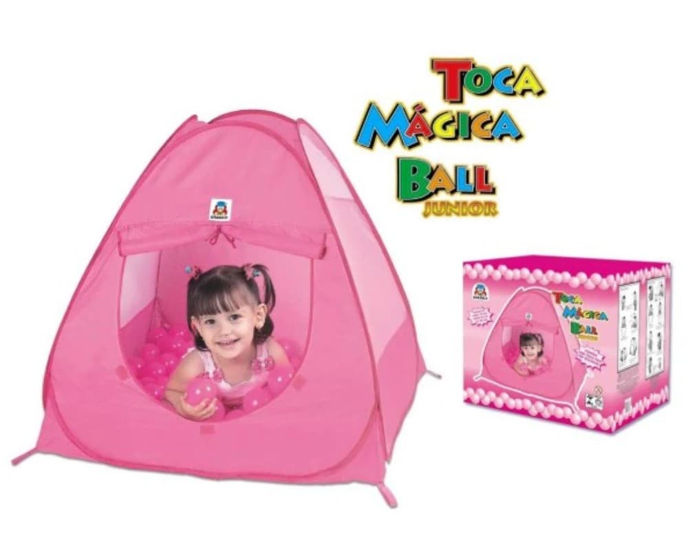 A **Toca Mágica Ball Júnior Rosa** é uma barraca infantil projetada para proporcionar diversão e estimular a criatividade das crianças. Fabricada em **tecido poliéster rosa** com estrutura em **aço**, ela é resistente e fácil de montar. Seu design inclui uma abertura frontal com tela, permitindo boa ventilação e visibilidade.