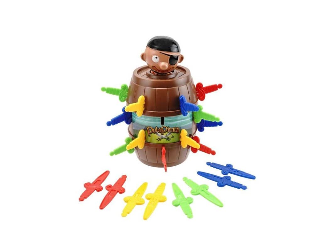 **Pula Pirata** é um jogo clássico da Estrela baseado em **suspense e sorte**. Os jogadores se revezam para inserir espadas coloridas no barril do pirata — mas cuidado: uma das espadas vai fazê-lo **pular para fora!** Ninguém sabe qual é, o que torna o jogo emocionante e imprevisível a cada rodada. Ideal para todas as idades, é simples, rápido e garante boas risadas em grupo.
