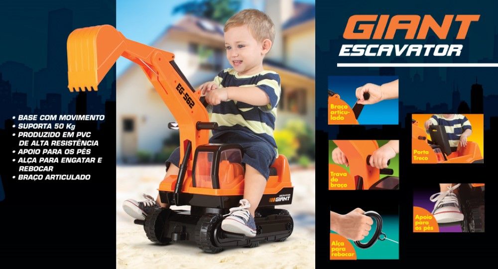 A Giant Escavator é a escavadeira feita em plástico resistente. O braço e a pá são controlados por manivelas. Vem com Porta Treco e alça para reboque.