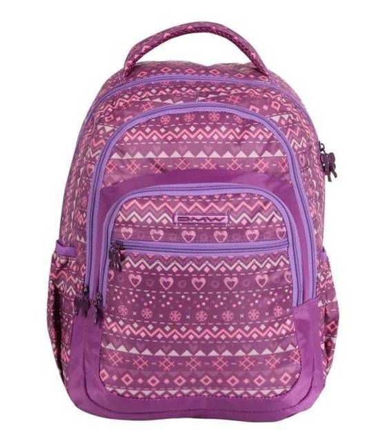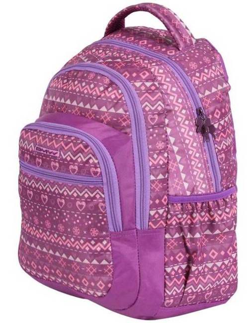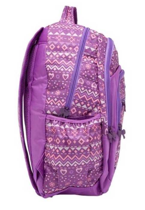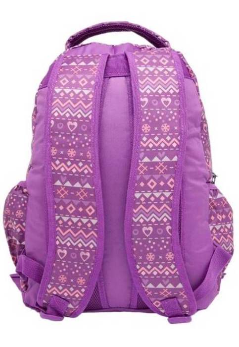 a mochila girls roxa, com mix de estampa em tons de rosa e roxo, possui alças de ombro reguláveis e fecho por zíper.