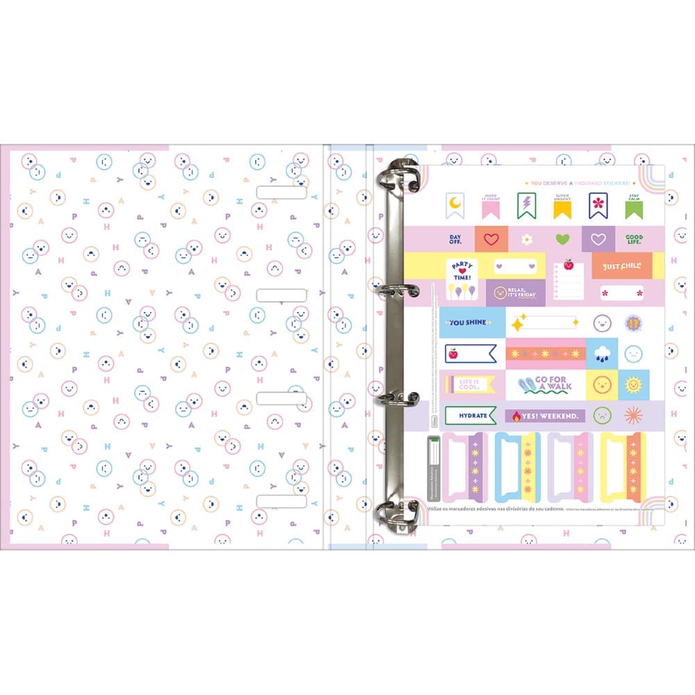O Caderno Argolado Cartonado Universitário com Elástico Happy 80 Folhas possui formato compacto, é leve e bastante funcional. Vem com folhas pautadas e bolsa plástica para guardar trabalhos e anotações. O fechamento em elástico garante segurança e praticidade.