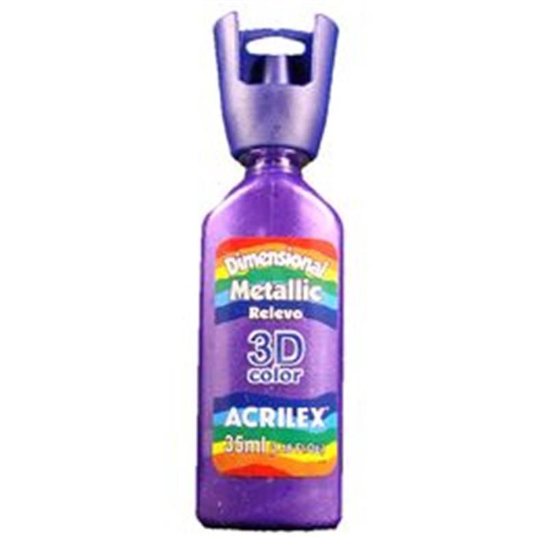 Dimensional Metálica - 35ml - Violeta - 561 da Acrilex. A Tinta Dimensional Relevo 3D é bastante versátil, e pode ser aplicada sobre diversos materiais, inclusive sobre tecidos. Resistente a lavagens e não tóxica. Apresentada em 4 versões: Brilliant, Metallic, Glítter e Acqua.