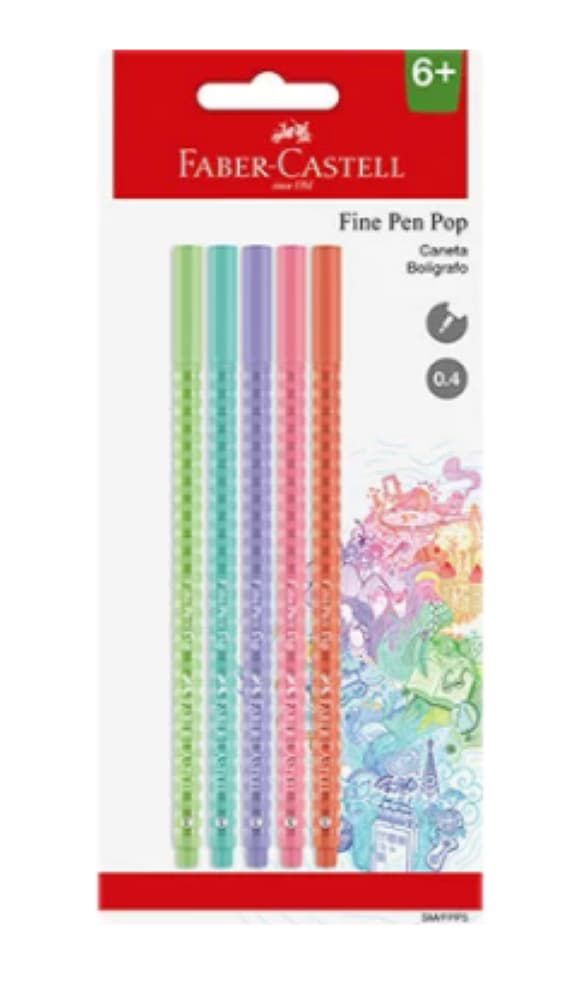 caneta hidrográfica fine pen pop bolígrafo faber-castell 5 cores tons pastel ponta fina 0.4MM Com um design mais despojado e cheio de diferencial para seu estojo. As canetas Fine Pen Pop nas cores Candy Color são incríveis para escrever, contornar e desenhar. Com a ponta ultrafina de 0.4mm e a tinta que não passa para o outro lado da folha, suas anotações nunca mais serão iguais. O Fine Pen Pop trás as cores que não podem faltar no seu dia a dia. Vem colorir o mundo com as Fine Pen Pop.<br><br>