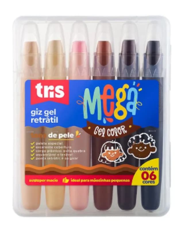O MEGA Gel que você já conhece agora em tons de pele! É um giz de traço super macio e com corpo plástico ergonômico que facilita a pegada. É retrátil, então não suja nem o estojo nem à mão! E é resistente à quebra. Tudo isso o torna um ótimo produto para a pré-escola.
