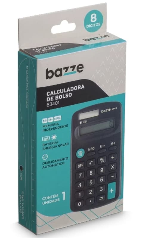 A calculadora de bolso B3401 possui corpo e teclas em plástico resistente! É 8 dígitos e possui alimentação dupla: pilhas e energia solar! Com desligamento automático e memória independente.