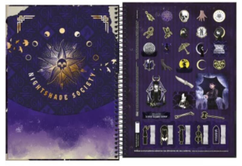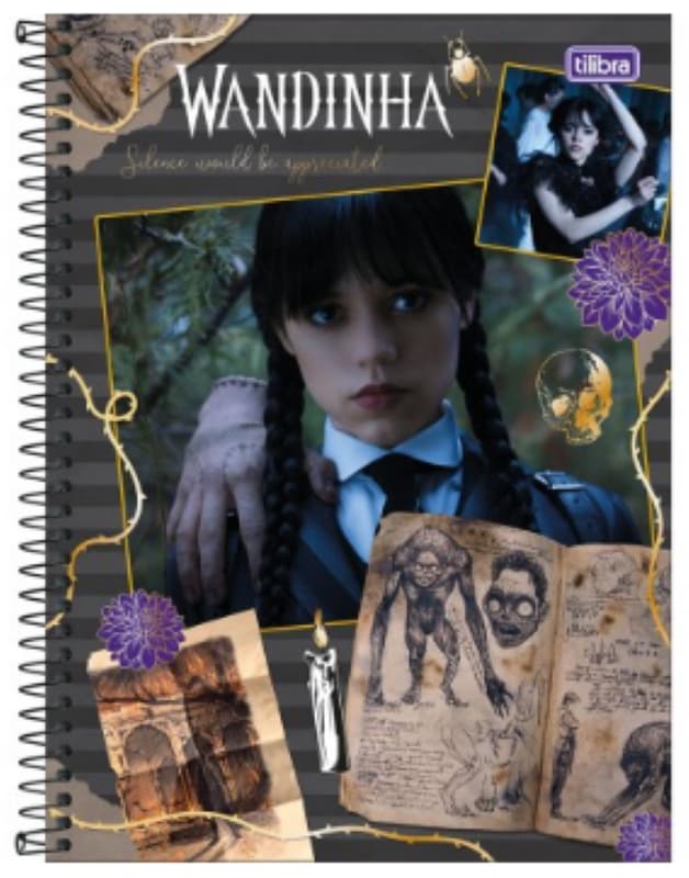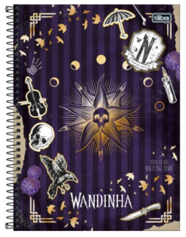 O Caderno Espiral Capa Dura Universitário 10 Matérias Wandinha 160 Folhas possui capa dura com acabamento metalizado, parte interna decorada, bolsa de papel decorada para guardar trabalhos e anotações, folha com adesivos funcionais e folhas pautadas. Ideal para o dia a dia na escola ou na faculdade.