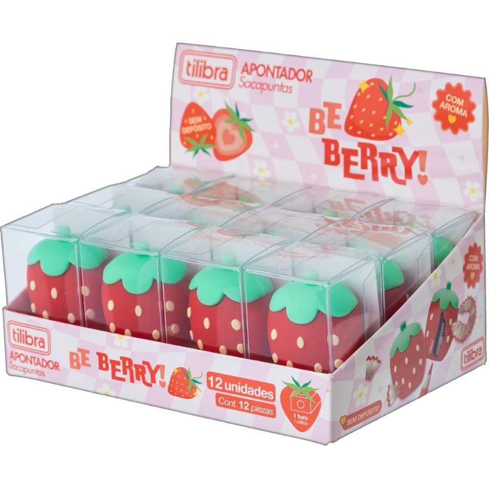 "O Apontador Be Berry! da Tilibra tornará o seu momento de estudos muito mais charmoso. Com um delicioso aroma da fruta, o produto é equipado com uma lâmina em aço carbono para garantir precisão e eficiencia na hora de apontar.