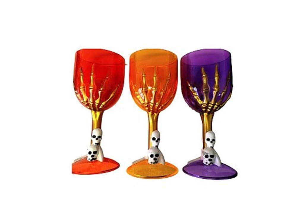 Design/Formato: A característica principal é o formato da haste (pé) da taça, que é moldada como uma mão de esqueleto (ou caveira) que parece estar segurando o bojo (copo) superior. Este design confere um visual tridimensional e dramático.