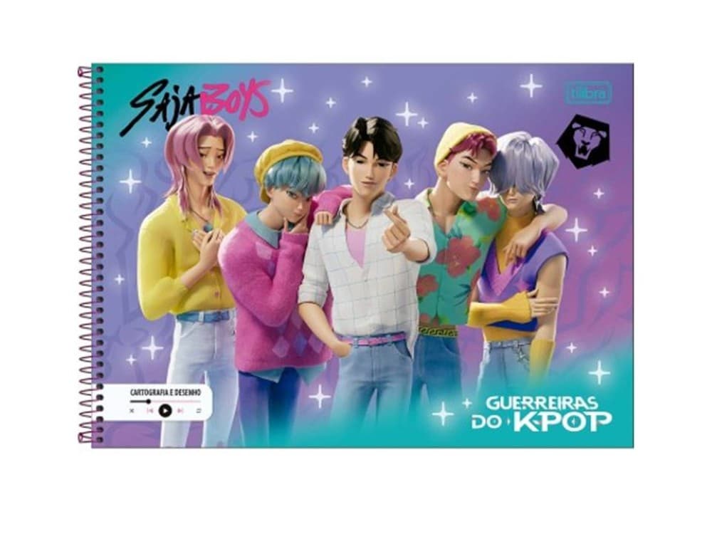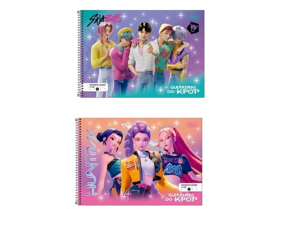 Capa: dura, com estampa temática “Guerreiras do K-Pop” e interior da capa decorado.