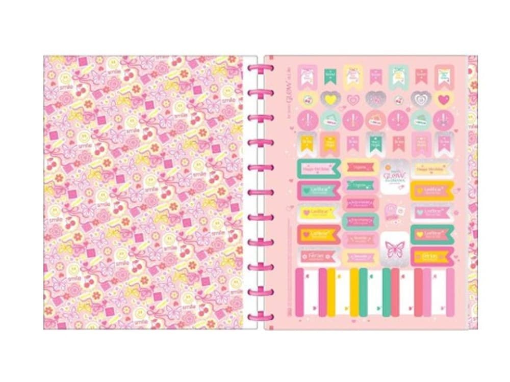 Acompanha bolsa plástica interna, índice/separadores de matérias, adesivos decorativos — facilita organização interna e personalização.