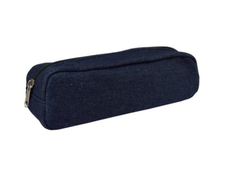 Estojo compacto e resistente, ideal para estudantes levarem lápis, canetas, borrachas e outros pequenos materiais escolares. Fabricado com tecido sintético de alta durabilidade no estilo denim, possui fechamento em zíper para maior segurança dos itens.