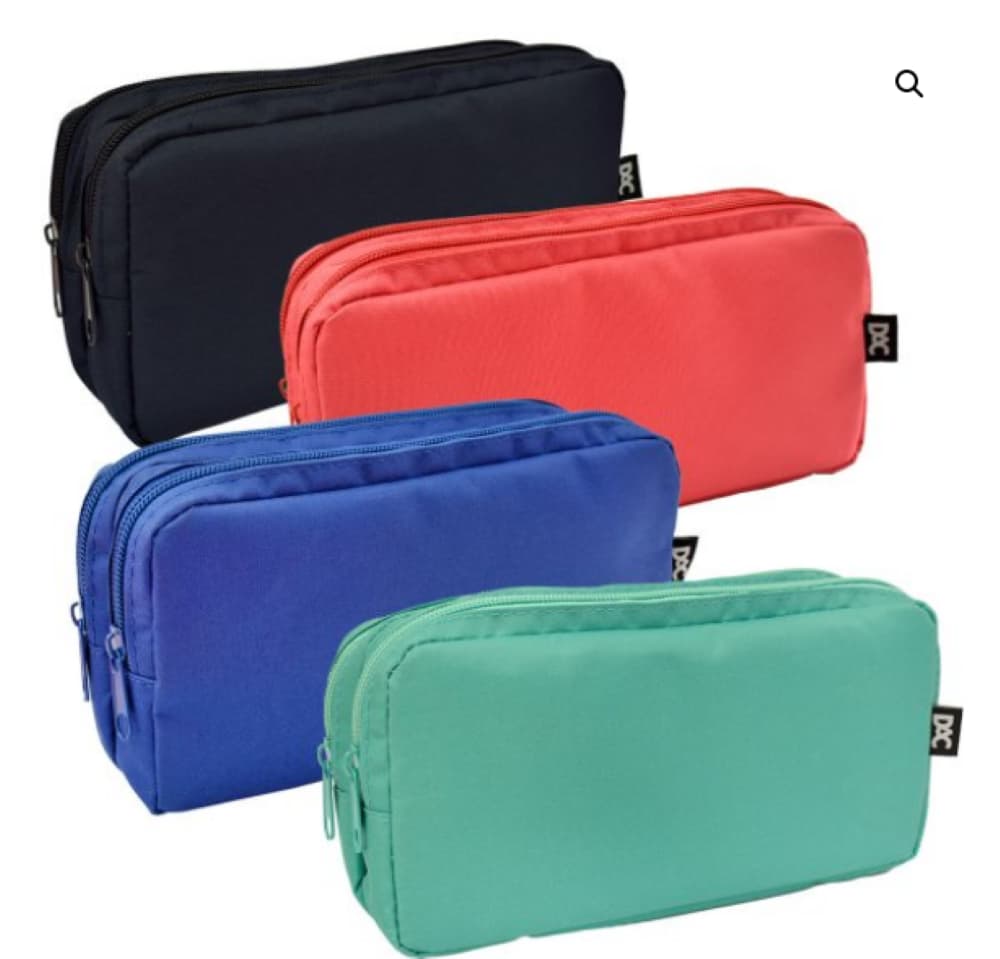 Estojo duplo prático e resistente, ideal para organizar lápis, canetas, borrachas e outros materiais escolares. Com dois compartimentos independentes, permite separar itens menores de forma organizada. Fabricado em tecido sintético durável, com fechamento seguro em zíper, disponível em cores sortidas para maior diversão.