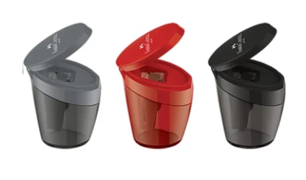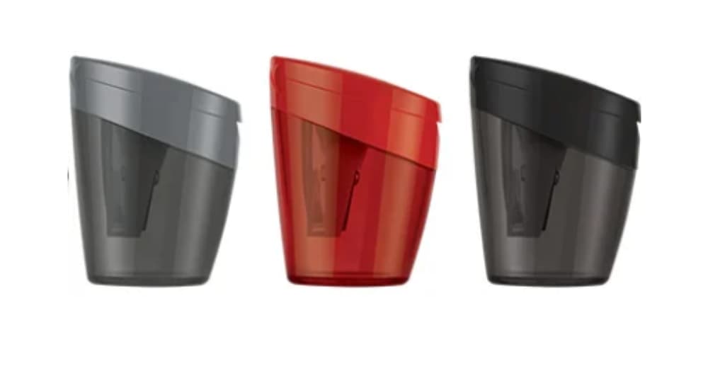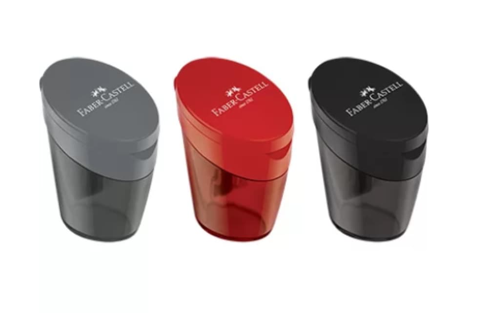 Apontador com depósito para maior praticidade, lâmina de aço temperado, tampa flip top. disponível nas cores vermelho, preto e cinza.