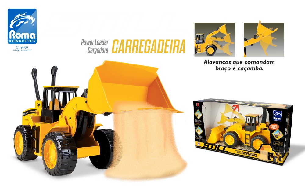 A carregadeira Still é articulada e possui alavancas que comandam o braço e a caçamba, você pode levantar e abaixar o braço de elevação, como também bascular a caçamba! Possui Chassis com acabamento. Não possui partes metálicas e não enferruja. Opere essa super máquina!