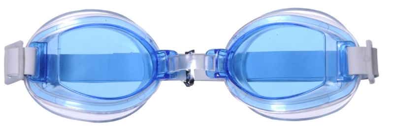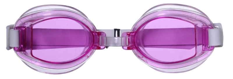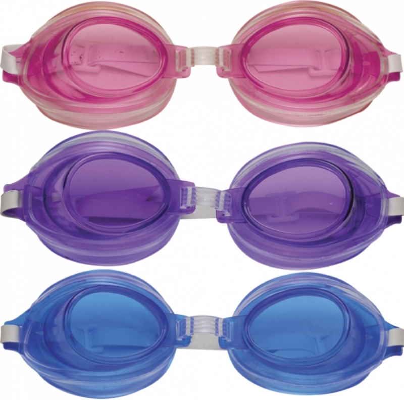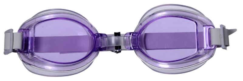 óculos de natação infantil no modelo fashion com lentes em poliestireno, pvc macio ao redor das lentes, tira regulável de borracha e regulagem entre as lentes em pvc. disponível nas cores: azul, lilás e rosa.