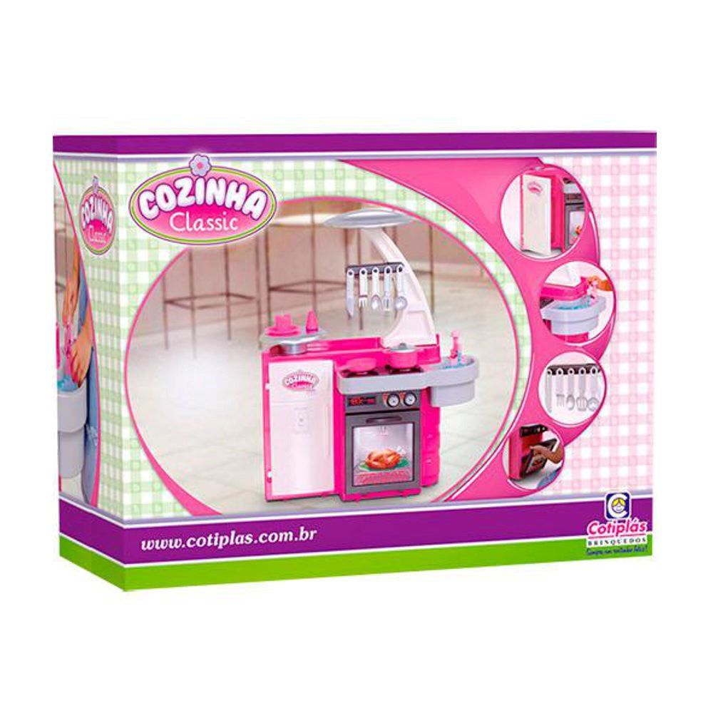 As meninas adoram brincar de casinha. Pensando em transformar essa brincadeira em algo ainda mais real, a Cotiplás traz como novidade a Cozinha Classic. Ela vem com todos os produtos para tornar a sua cozinha em realidade. A geladeira abre e fecha, o forno abre e fecha, a pia sai água de verdade e os botes giram.