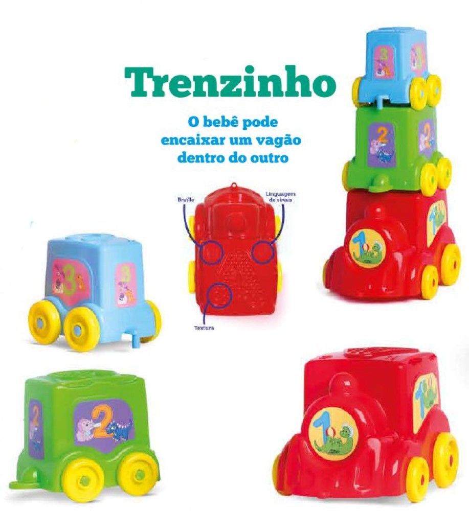 Os pequenos vão se divertir muito com Trenzinho Baby. Ele é super alegre e colorido, os pequenos vão passar horas brincando com esse trenzinho. A Diversão será garantida. O Trenzinho da Super Toys é um super lançamento para atender as crianças com necessidades especiais. Os Vagões possuem as letras A, B, C com texturas, assim criando o reconhecimento da letra. Possui também as letras em braile e também os desenhos da letra na linguagem de sinais. A Criança pode se divertir montando o trenzinho de três formas diferentes: horizontalmente, verticalmente, e pode encaixar um vagão dentro do outro. É só encaixar, soltar a imaginação e iniciar a diversão!