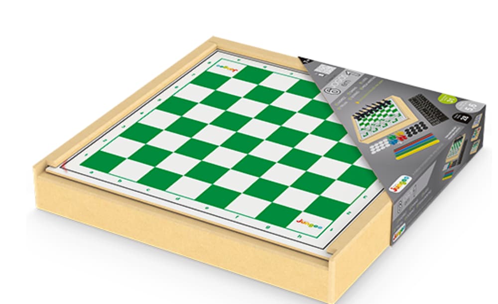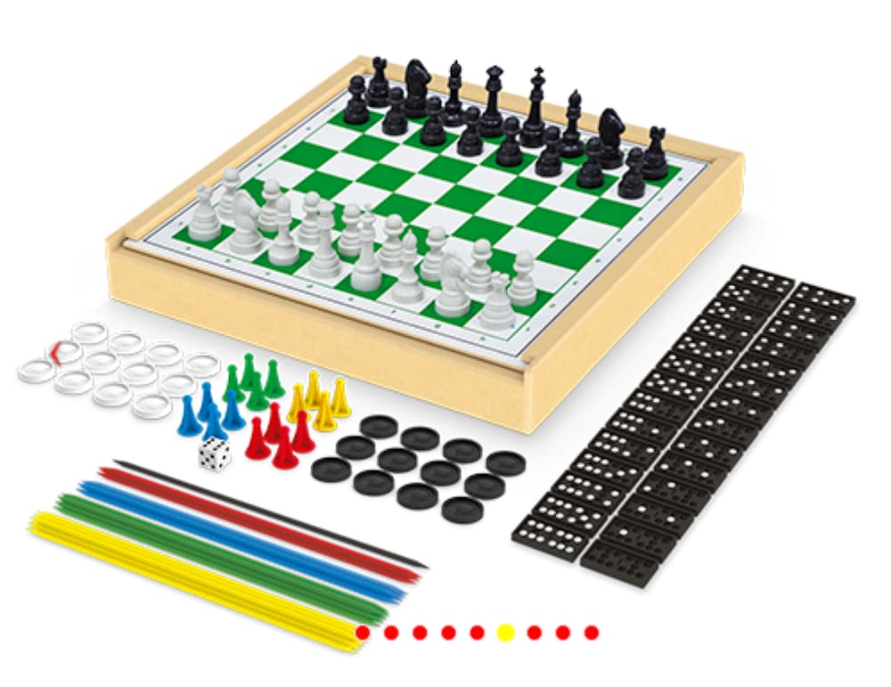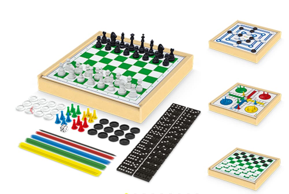 Jogo 6 em 1 (xadrez, ludo, damas, trilha, pega-varetas e dominó) da Junges é um jogo tradicional de tabuleiro com estojo em madeira MDF. Acompanha kit de peças em plástico (rei 5,6cm) e regras básicas. Tamanho do tabuleiro 27x27 cm.