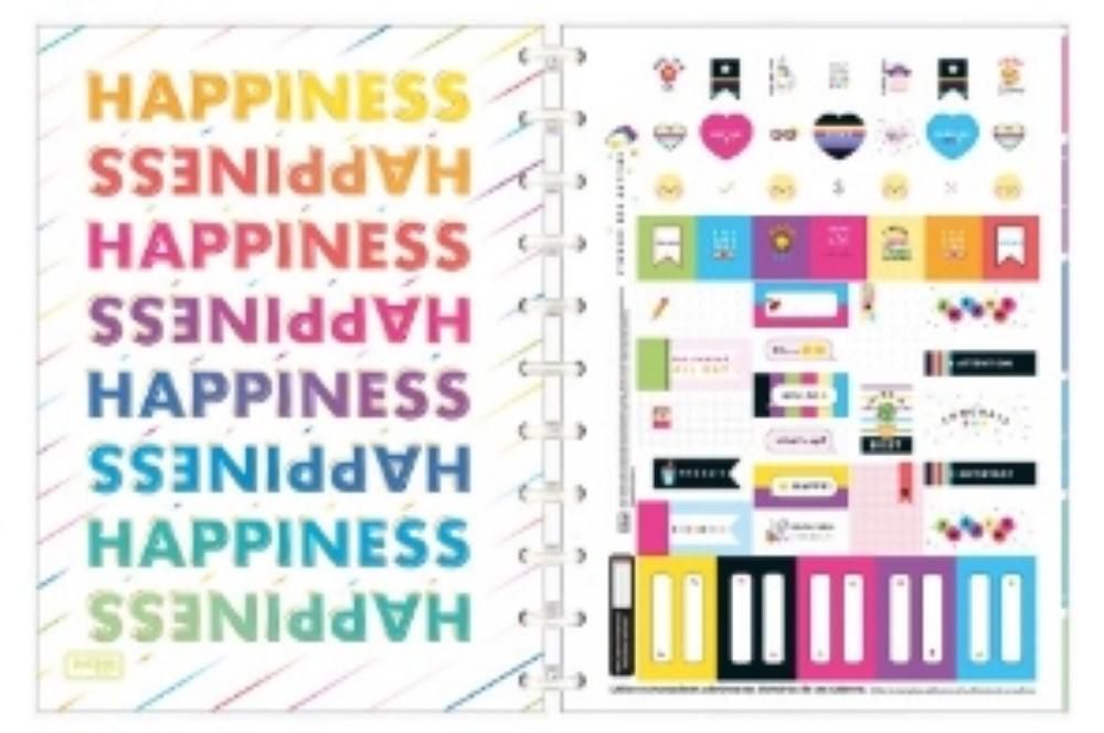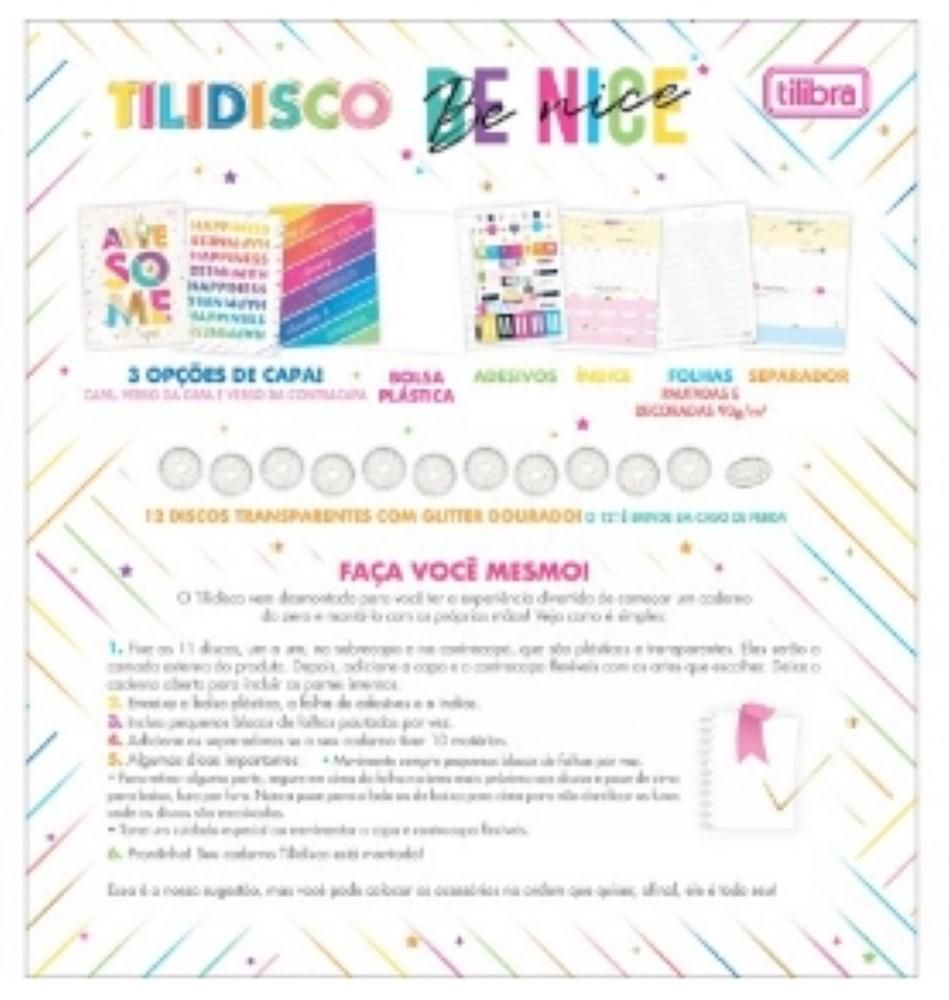 O Tilidisco também conta com índice decorado, bolsa plástica, adesivos, pacote com 12 discos, com 26 mm de diâmetro, transparentes com glitter dourado, sendo 1 de brinde para caso de perda, e folhas pautadas e decoradas, com gramatura de 90 g/m², para facilitar o encaixe dos discos e oferecer mais possibilidades para escrita com diversos tipos de canetas.