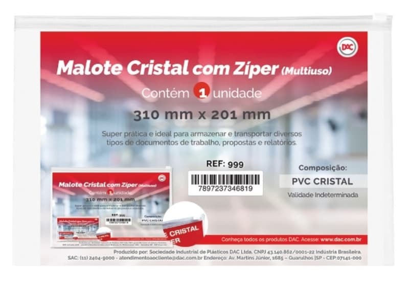 O malote da DAC é um item muito versátil para usar na escola, em casa ou no dia a dia. Ideal para organizar, guardar ou transportar objetos, documentos, materiais escolares entre outros. Produzido em PVC Cristal tranparente é resistente à água, fechamento em zíper slide branco, prático e fácil de levar para qualquer lugar, principalmente itens de higiene, roupinhas infantis, materiais escolares entre outros.