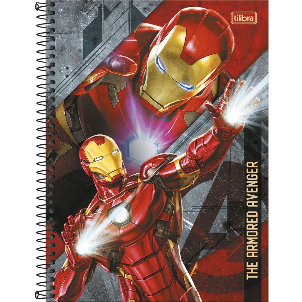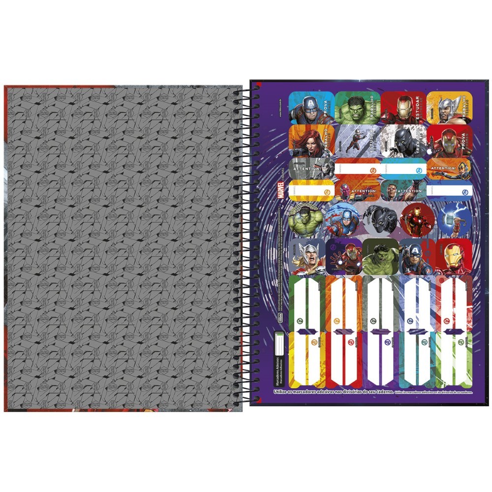 O Caderno Espiral Capa Dura Universitário 10 Matérias Avengers 160 Folhas possui capa dura com a parte interna decorada, bolsa plástica para guardar trabalhos e anotações, folha com adesivos funcionais, folhas pautadas e espiral colorido. Ideal para o dia a dia na escola ou na faculdade.