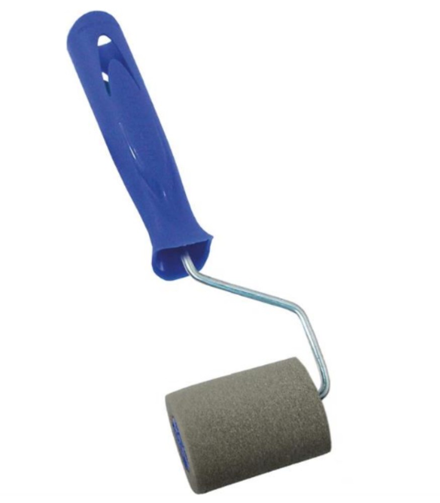 Rolo de espuma cinza mesclada: poliéster + poliéter. Cabo copolímero azul. Ideal para aplicação com tintas e produtos à base de água.