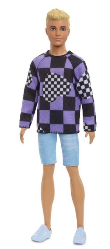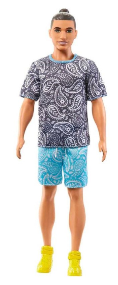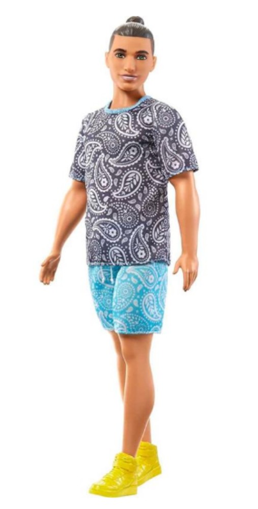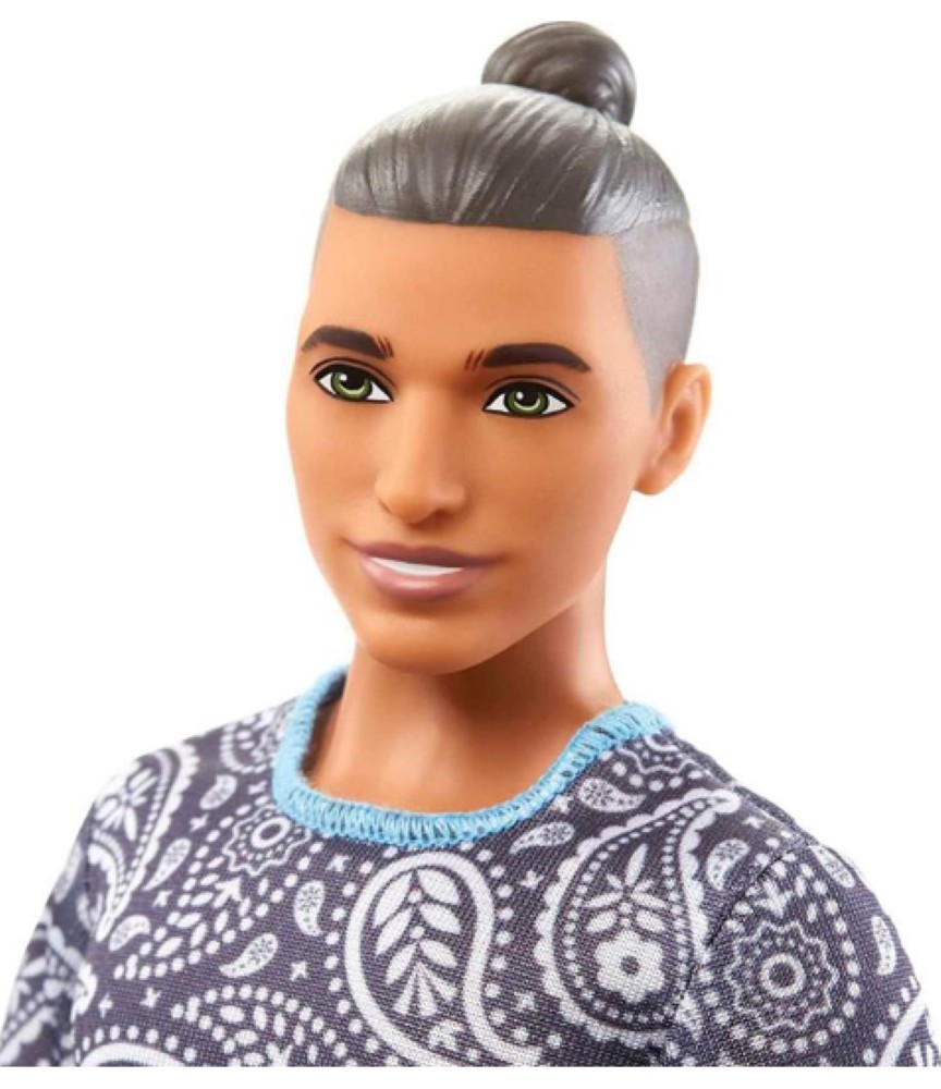 Ken® Fashionistas™ com roupas e sapatos da moda. Personagens e conjuntos de moda são vendidos separadamente, sujeitos a disponibilidade. O Ken® não fica em pé sozinho. Os sapatos sem salto encaixam nas bonecas com tornozelos articulados ou pés achatados. As cores e as decorações podem variar.