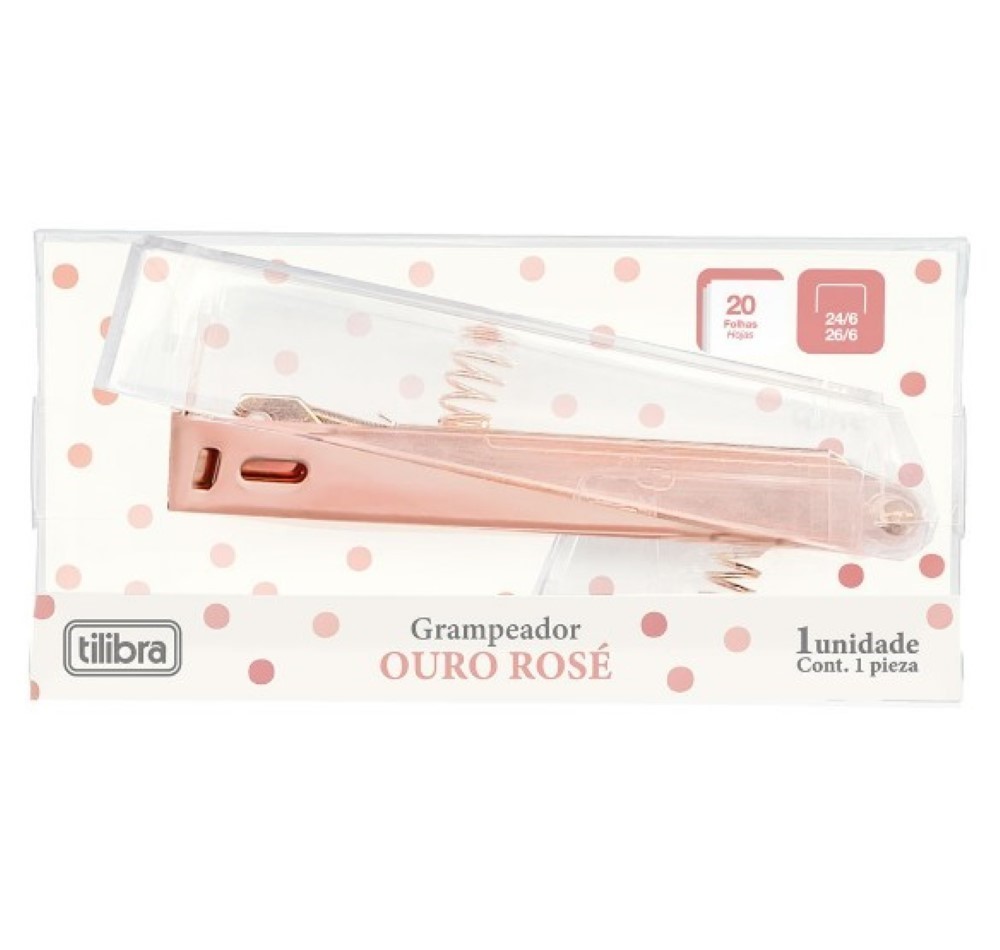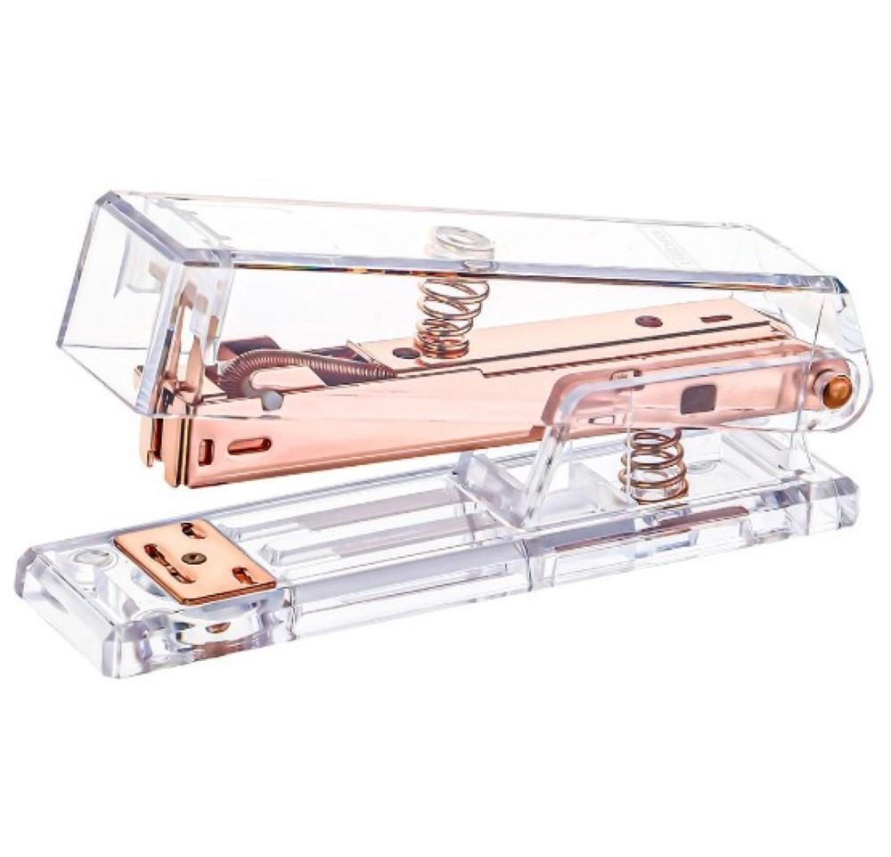 Um belíssimo grampeador feito de acrílico, com um design contemporâneo e curvilíneo, apresenta um tamanho considerável. Aprimore a decoração do seu home office com uma coleção completa desses itens. Todo o corpo é revestido em ouro rosa, não incluindo grampos. Os grampos padrão, disponíveis em qualquer papelaria, são compatíveis com este produto. Observa-se que, devido às variações de lote, a cor pode ser mais intensa ou mais suave. Este modelo está disponível apenas na forma arredondada, com dimensões de 12 centímetros.