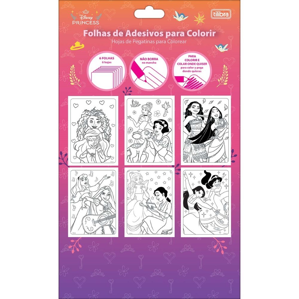 As Folhas de Adesivos para Colorir Princesas possuem 6 desenhos para pintar e colar do jeito que a imaginação permitir!