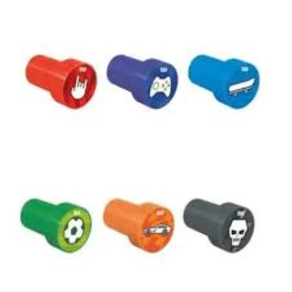 O Carimbo Radical chegou para conquistar os amantes de aventura! Carimbo autotintado com reservatório interno de tinta. São 6 diferentes opções de estampas que estimulam o aprendizado e a diversão.