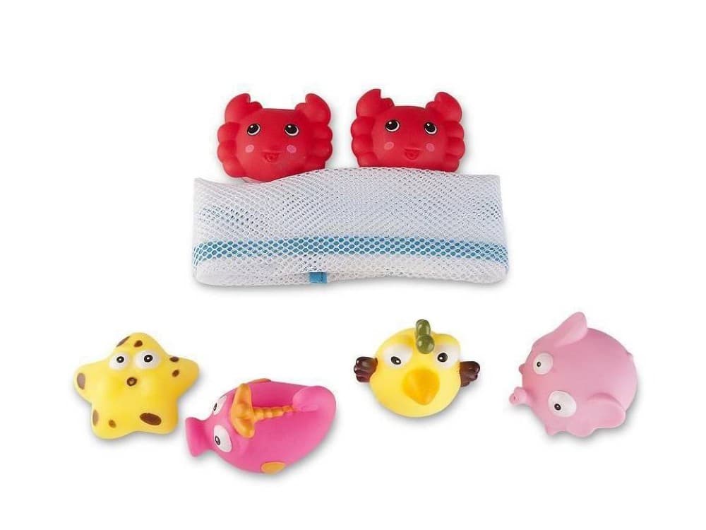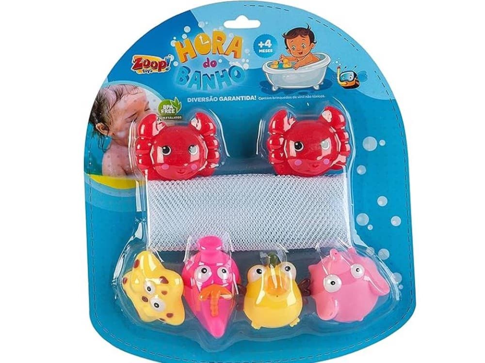 É um kit de brinquedos para o banho, ideal para divertir bebês durante esse momento.