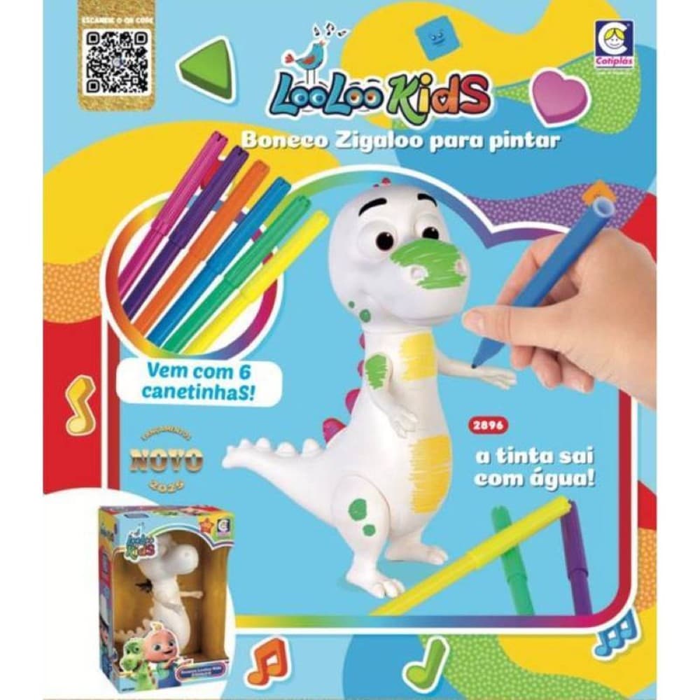 O Boneco Zigaloo para Pintar da linha Looloo Kids (Cotiplás) é perfeito pra soltar a criatividade da criançada! Esse dinossaurinho divertido em vinil macio vem com canetinhas coloridas pra pintar, brincar e, depois, lavar com facilidade - garantindo diversão sem bagunça. O design expressivo e as cores vivas fazem com que cada criação seja única. Ideal pra estimular coordenação, imaginação e amor pela arte!