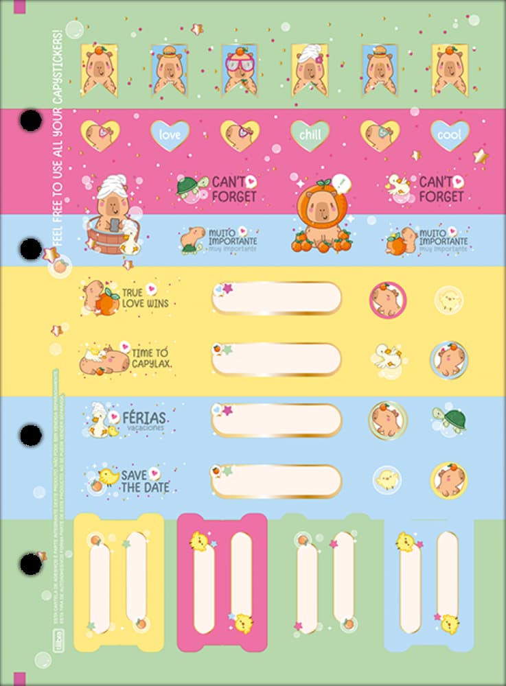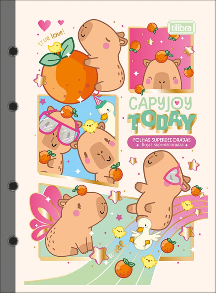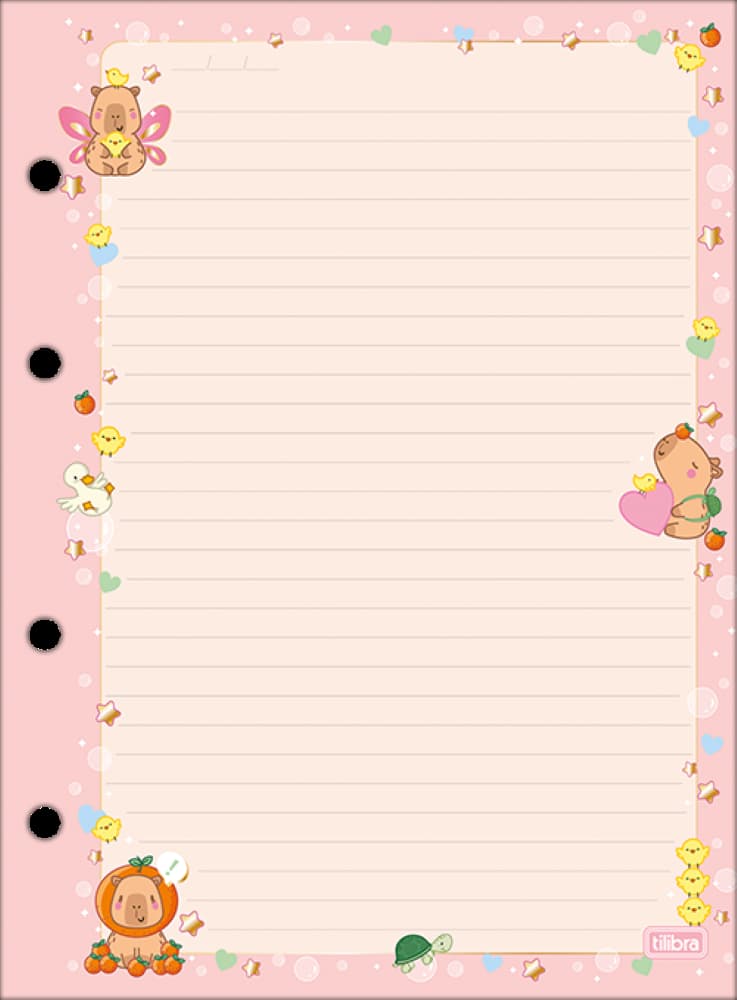 O refil oficial da linha CapyClub traz 80 folhas pautadas decoradas de capivaras fofinhas em papel de alta qualidade. Ideal para quem já usa o fichário Tilibra, ele deixa seu material super organizado com estilo!