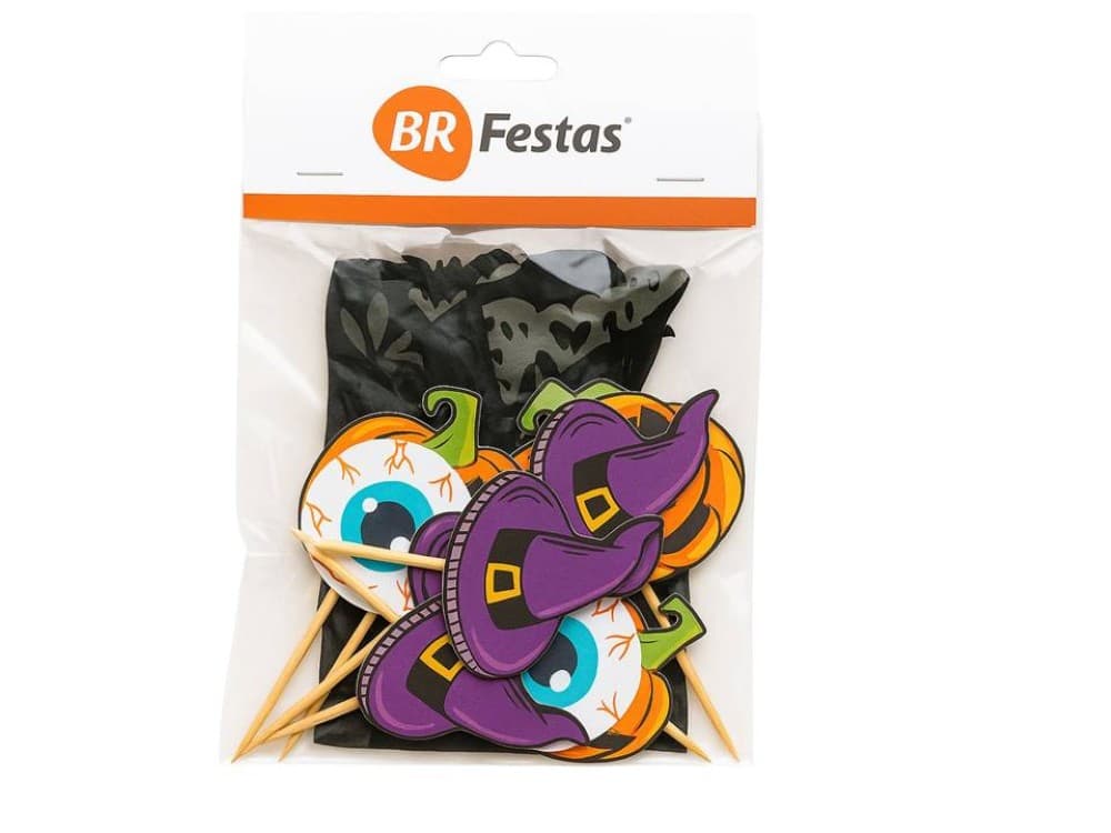 Os kits "sortidos" da BR Festas costumam incluir figuras clássicas do Halloween, como:
