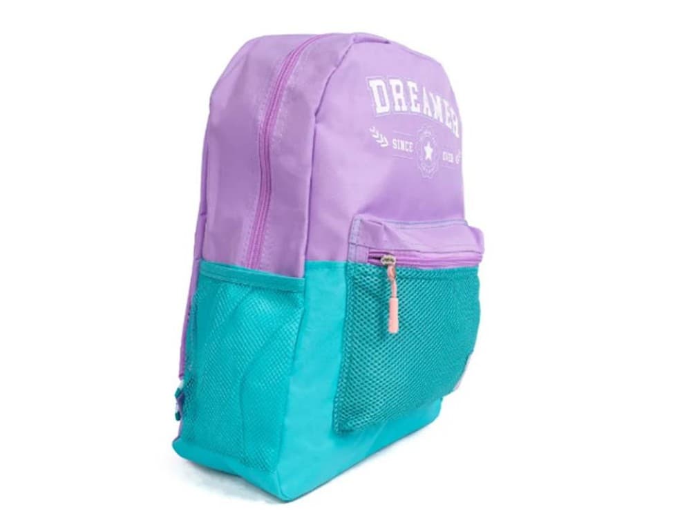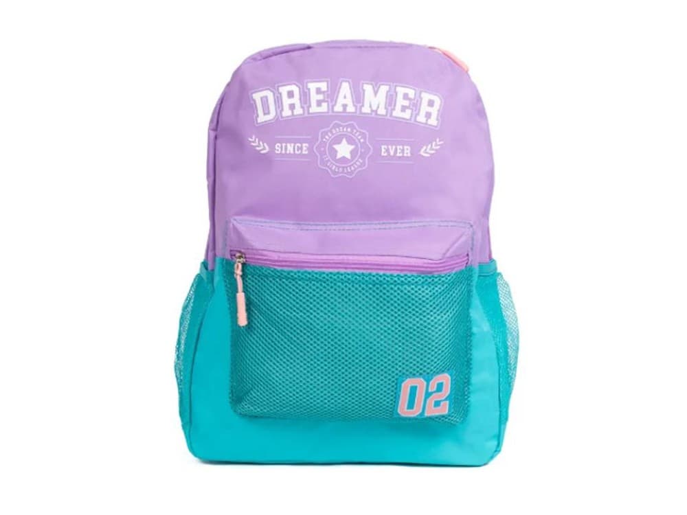Fabricada em poliéster reforçado, conta com compartimento principal amplo, bolso frontal com zíper e dois bolsos laterais em tela ideais para garrafas. O fechamento em zíper duplo com puxadores metálicos garante durabilidade, enquanto o tecido resistente mantém seus pertences protegidos. Com design moderno, a parte frontal apresenta as palavras ?DREAM? na parte superior e ?02? na inferior, criando um visual divertido e cheio de atitude. As alças acolchoadas proporcionam conforto ergonômico e ventilação, ideais para o uso prolongado.