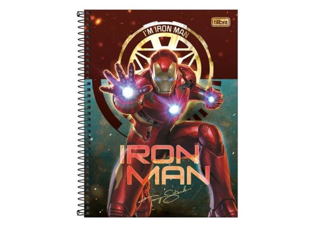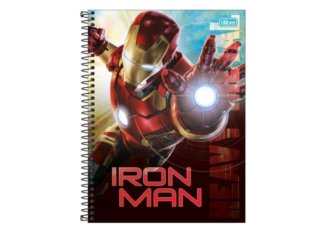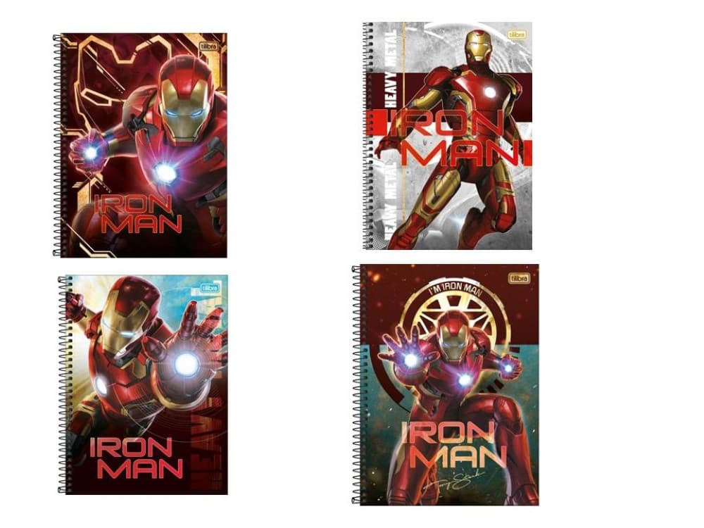 Capa dura com acabamento metalizado e parte interna decorada — visual com tema do super-herói Iron Man, ideal para fãs.