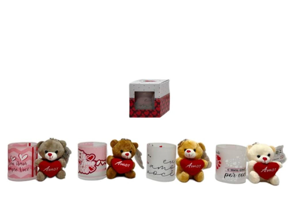 O Kit FC-2850 é composto por uma caneca de vidro transparente com estampas românticas e frases de amor, acompanhada de um mini urso de pelúcia que vem posicionado dentro da caneca com embalagem.sortidas.